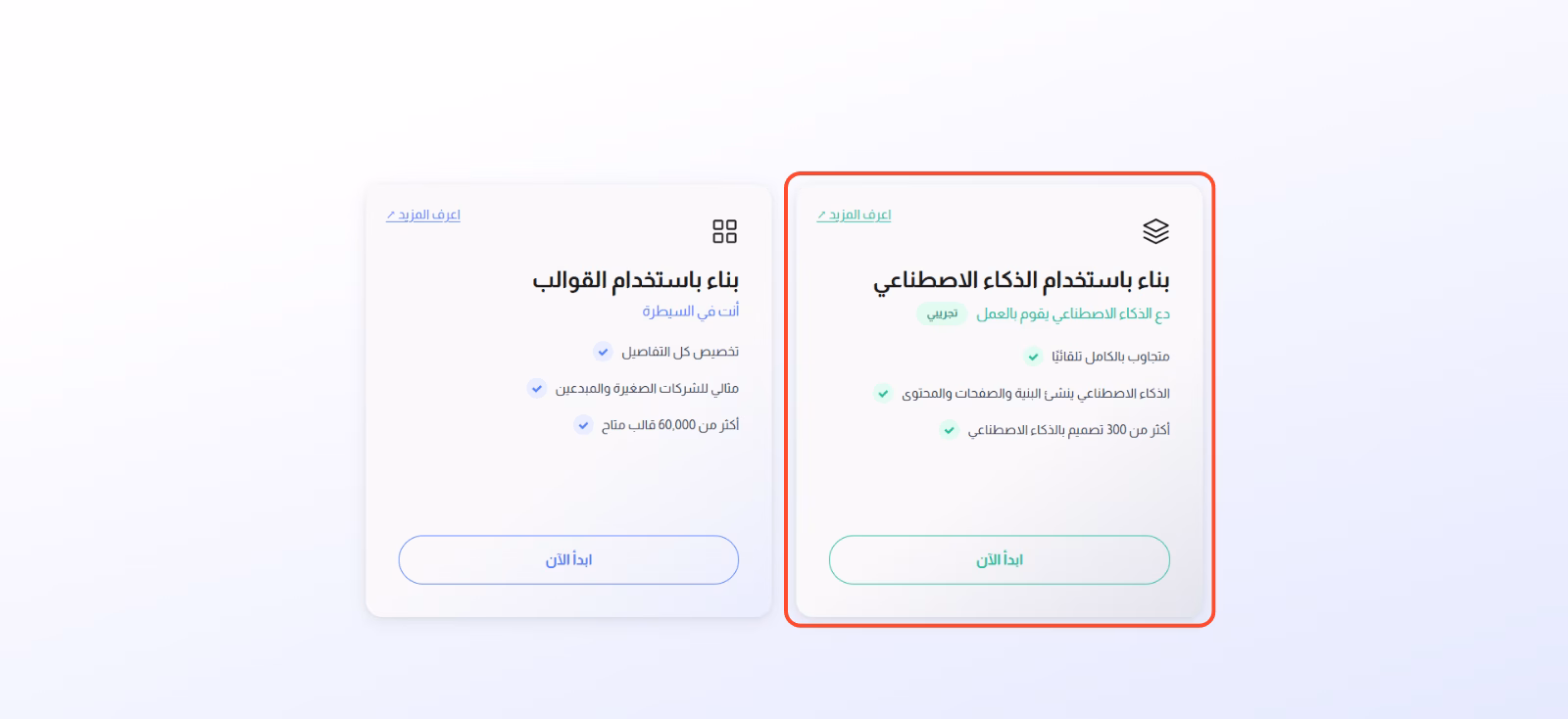 بعد الإجابة على الأسئلة الأولية والضغط على ابدأ البناء (Start Building)، اختر خيار البناء باستخدام الذكاء الاصطناعي (Build With AI).
