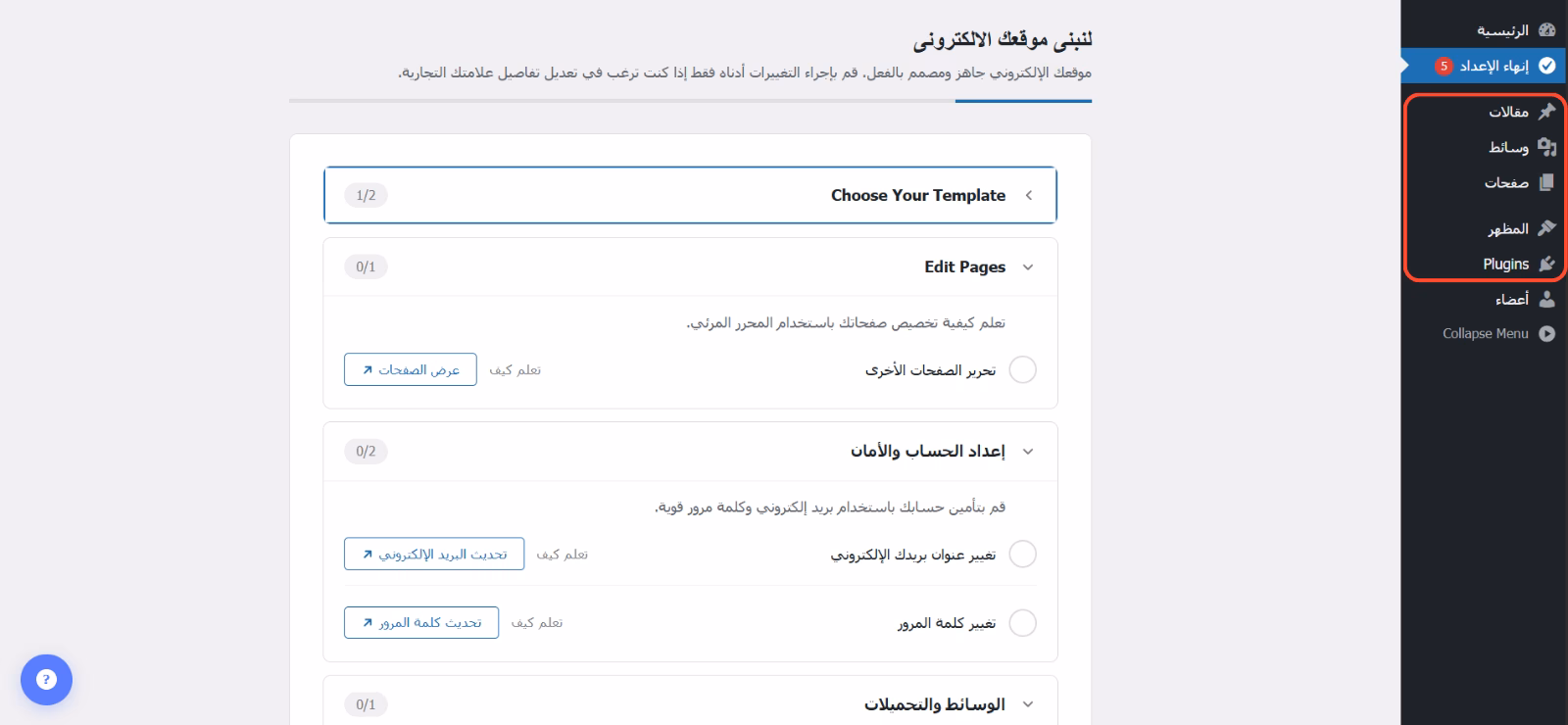 سيقوم النظام تلقائيًا بتثبيت القالب وتجهيز موقعك.
