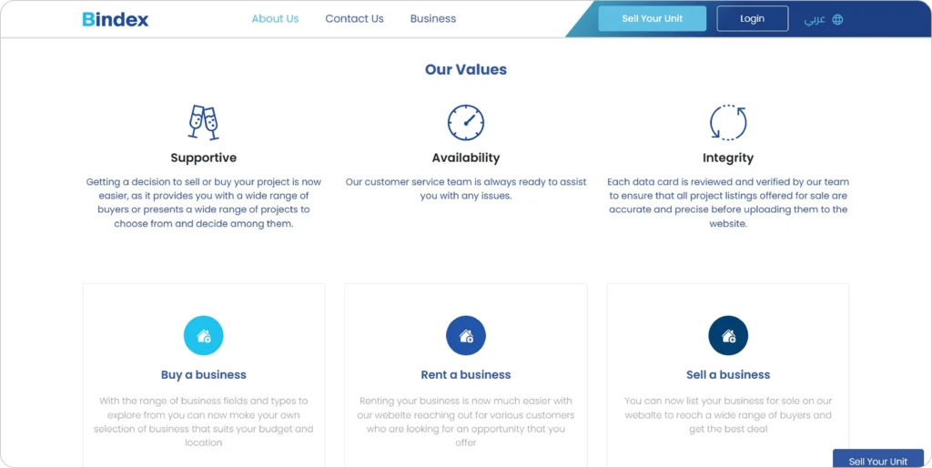 تعد Bindex منصة مخصصة لتبسيط عملية بيع وشراء الشركات، مما يمكّن رواد الأعمال والمستثمرين من التواصل بسهولة. قامت WebOps بتصميم وتطوير موقع إلكتروني حديث وسهل الاستخدام يعزز الظهور، ويبسّط عمليات إدراج الشركات والبحث عنها.