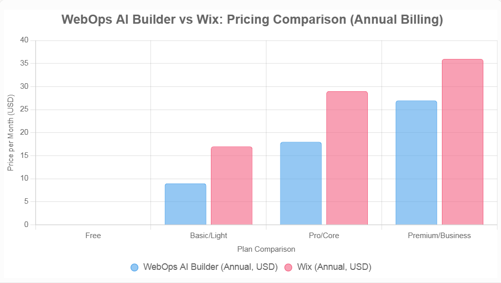 Feature WebOps AI Builder (Free) WebOps AI Builder (Basic) WebOps AI Builder (Pro) WebOps AI Builder (Premium) Wix (Free) Wix (Light) Wix (Core) Wix (Business)